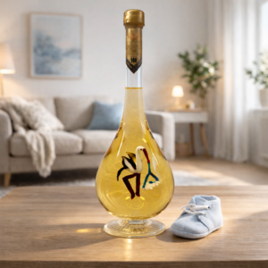 Húzott nyakú talpas csepp formájú palack, gólya babával 0,5 liter